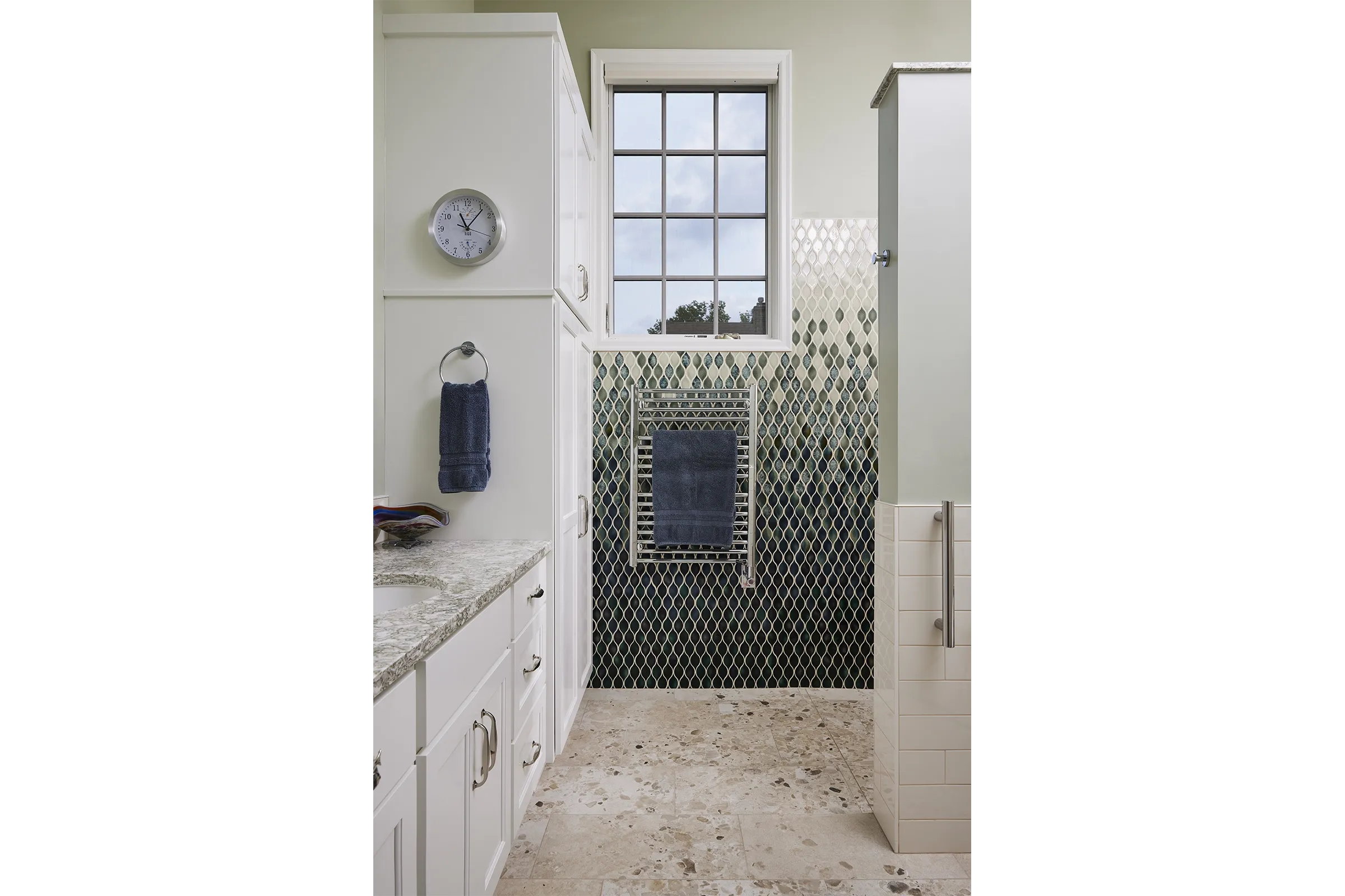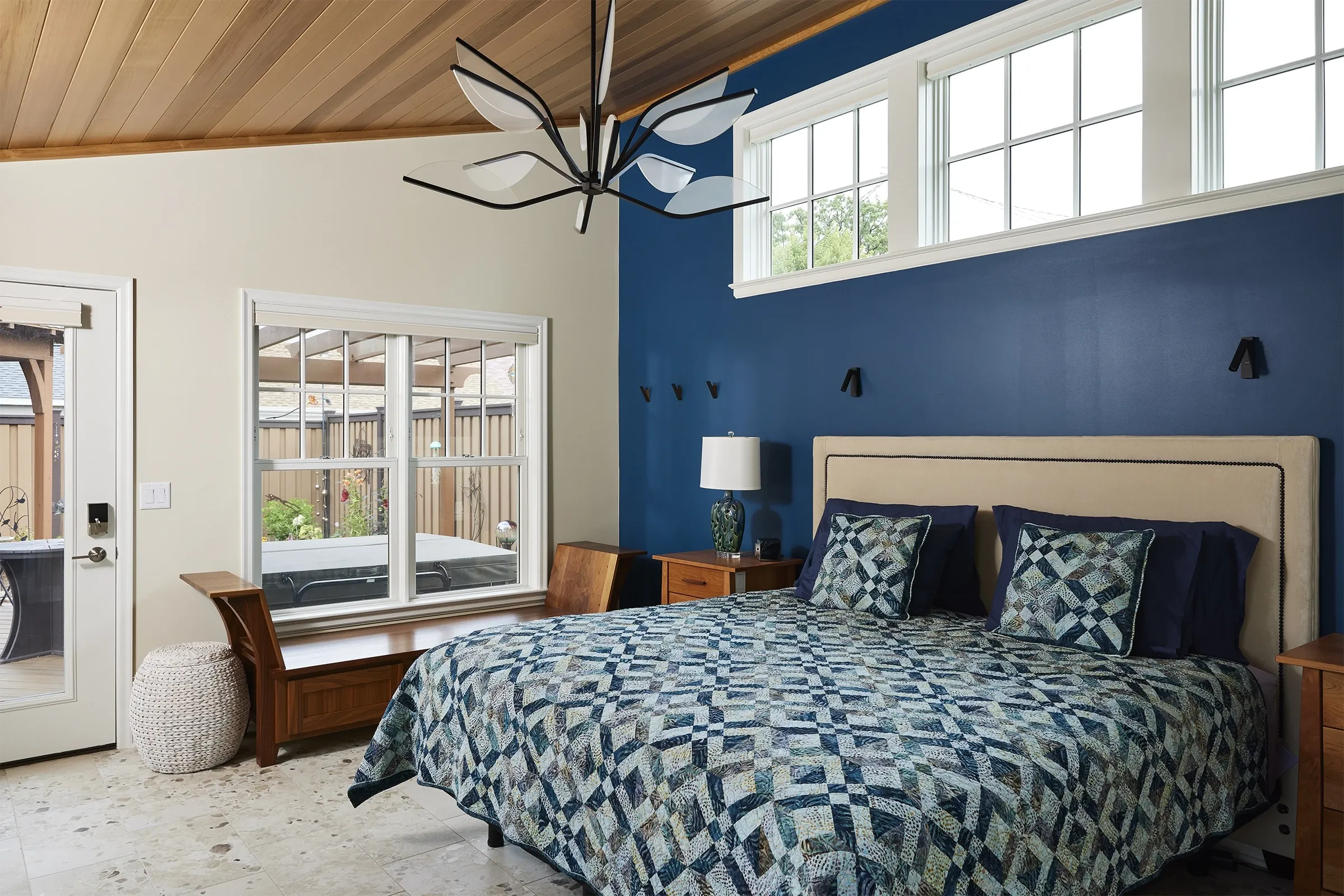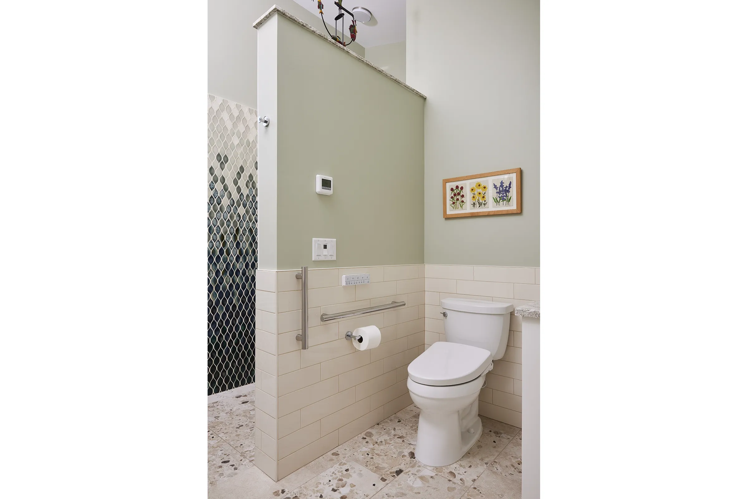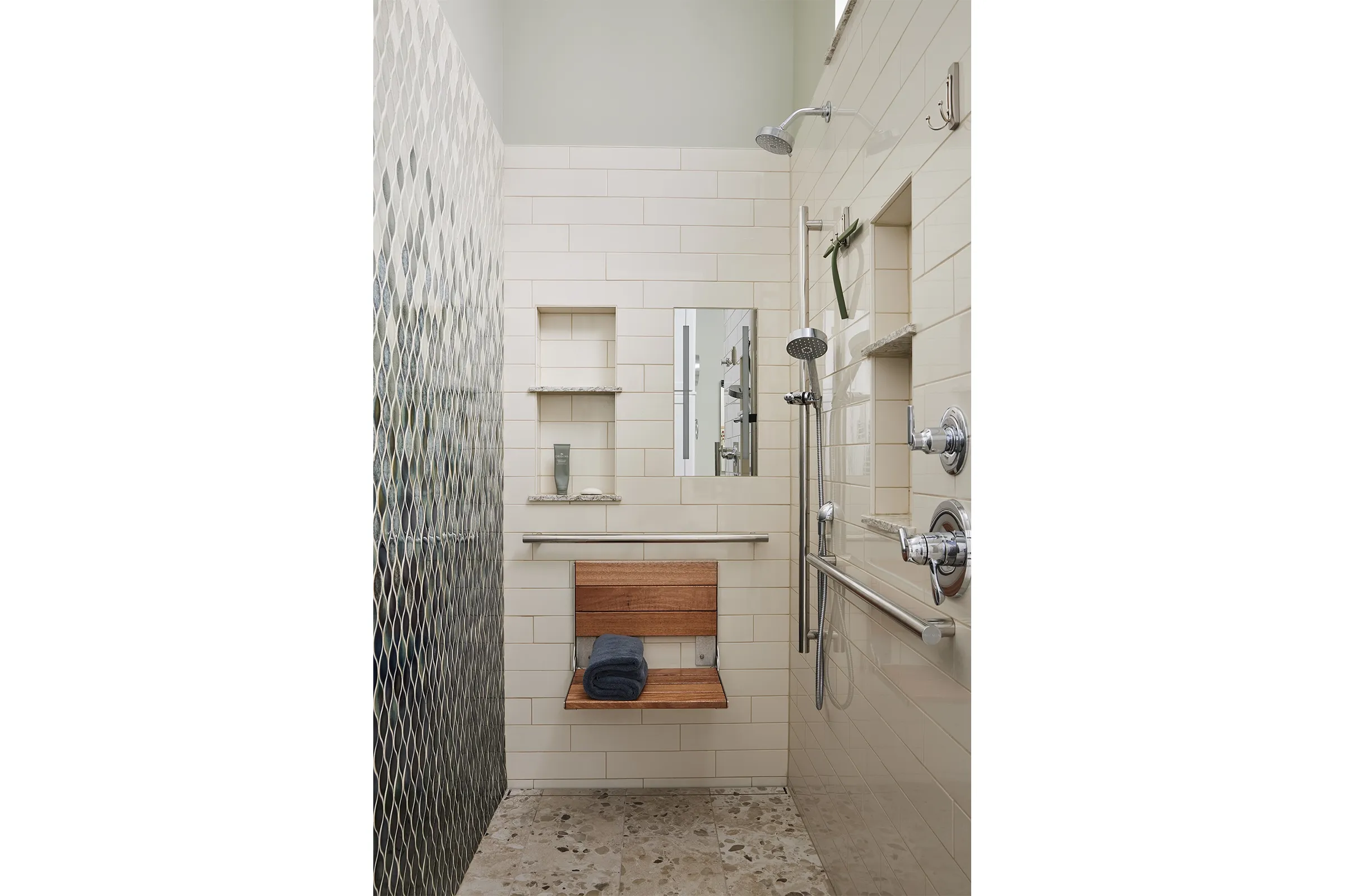 The owners of this house were retired and had their primary bedroom on the second floor and wanted to create a wheelchair accessible suite on the main level for aging in place. The project entailed an addition into the backyard for the new owner’s suite and new siding, trim and windows on the main house. The addition features fully accessible spaces, large windows and skylights, vaulted ceilings, main level laundry, a new walk-in closet and customized storage. Custom tile layouts, sculptural light fixtures, and wood ceilings accentuate the spaces. The project received two National Association of the Remodeling Industry (NARI) awards for the Universal Bath & Residential Addition Categories.