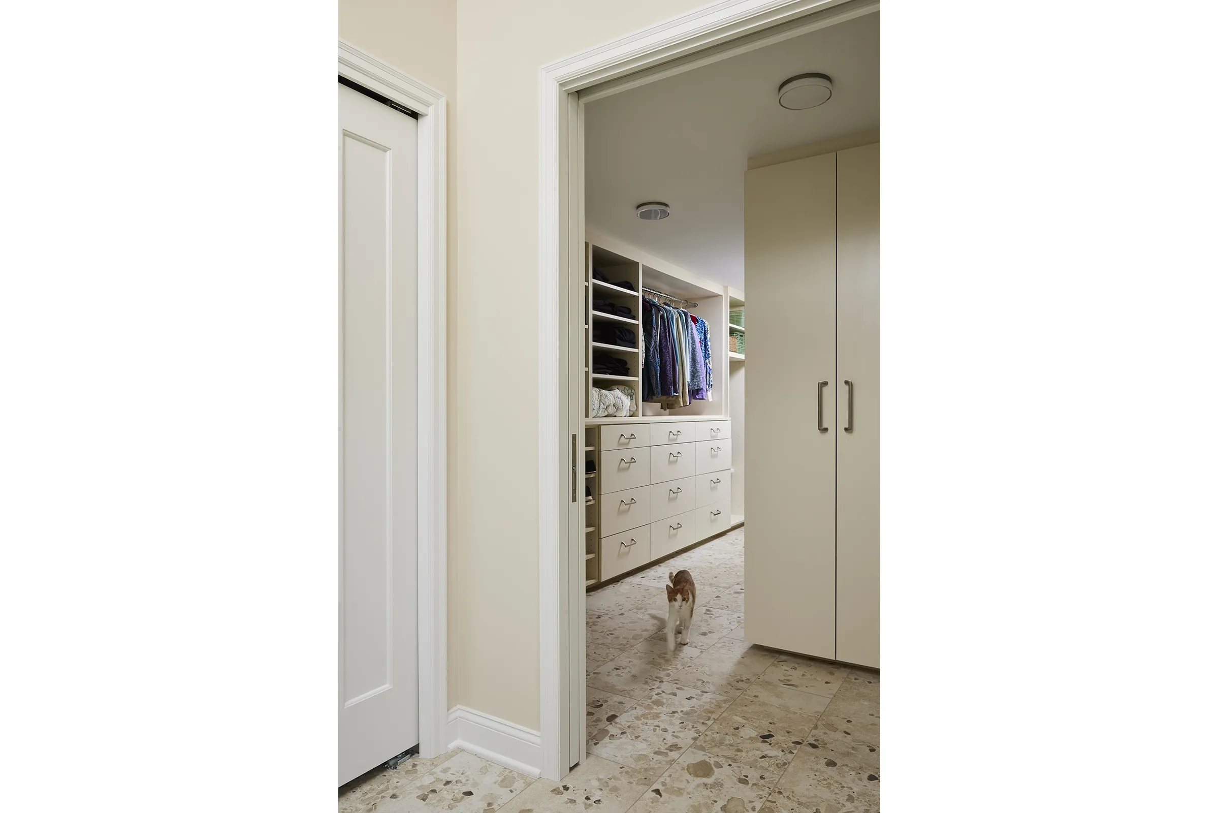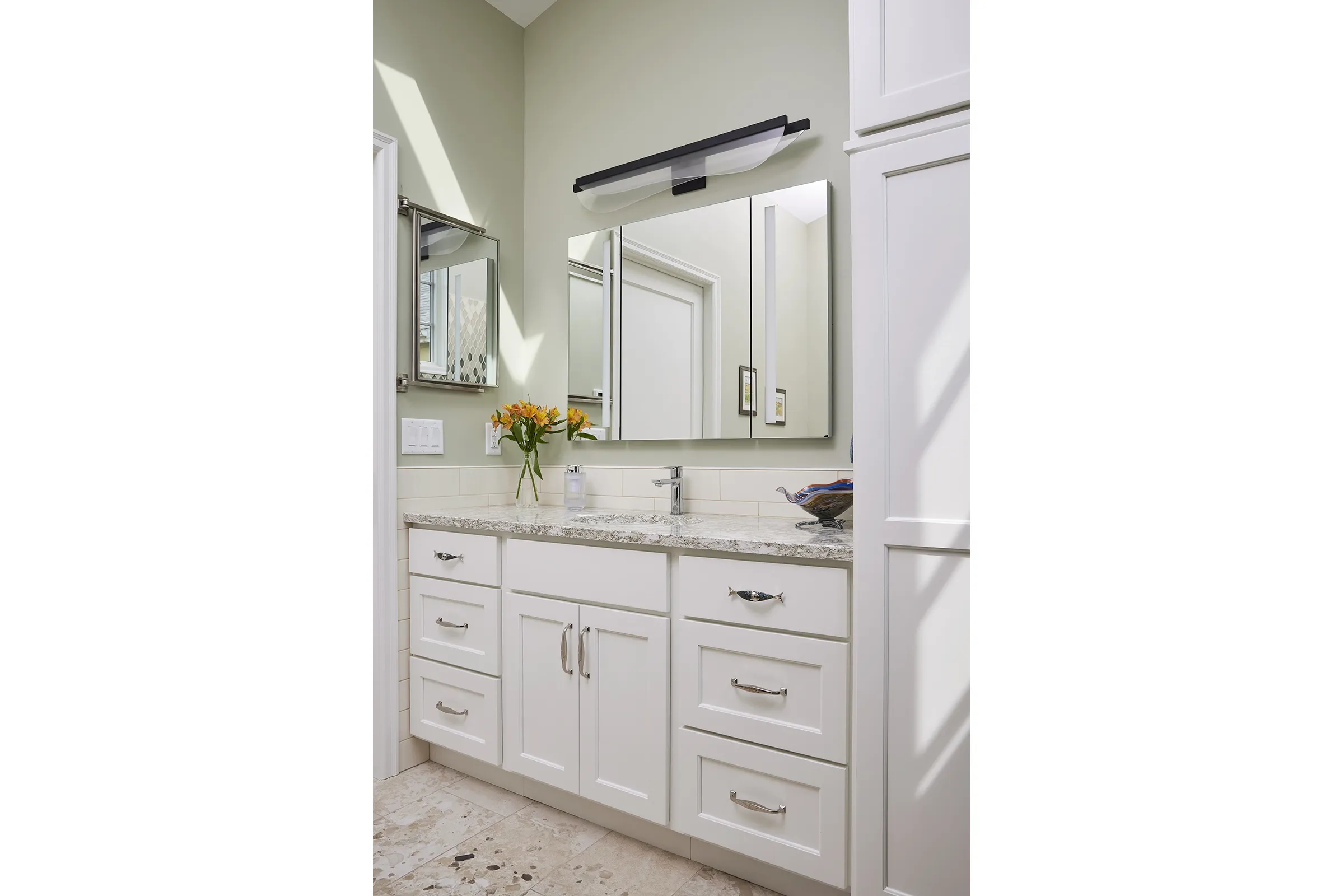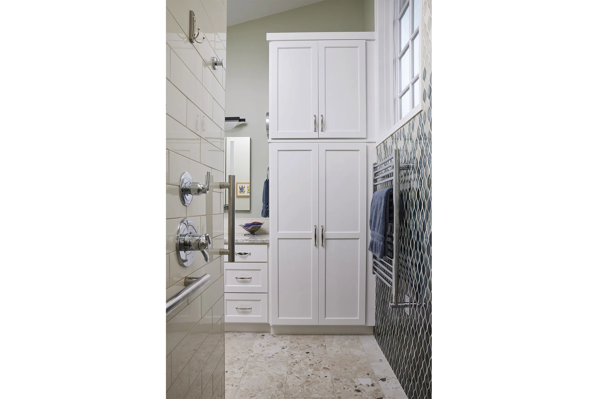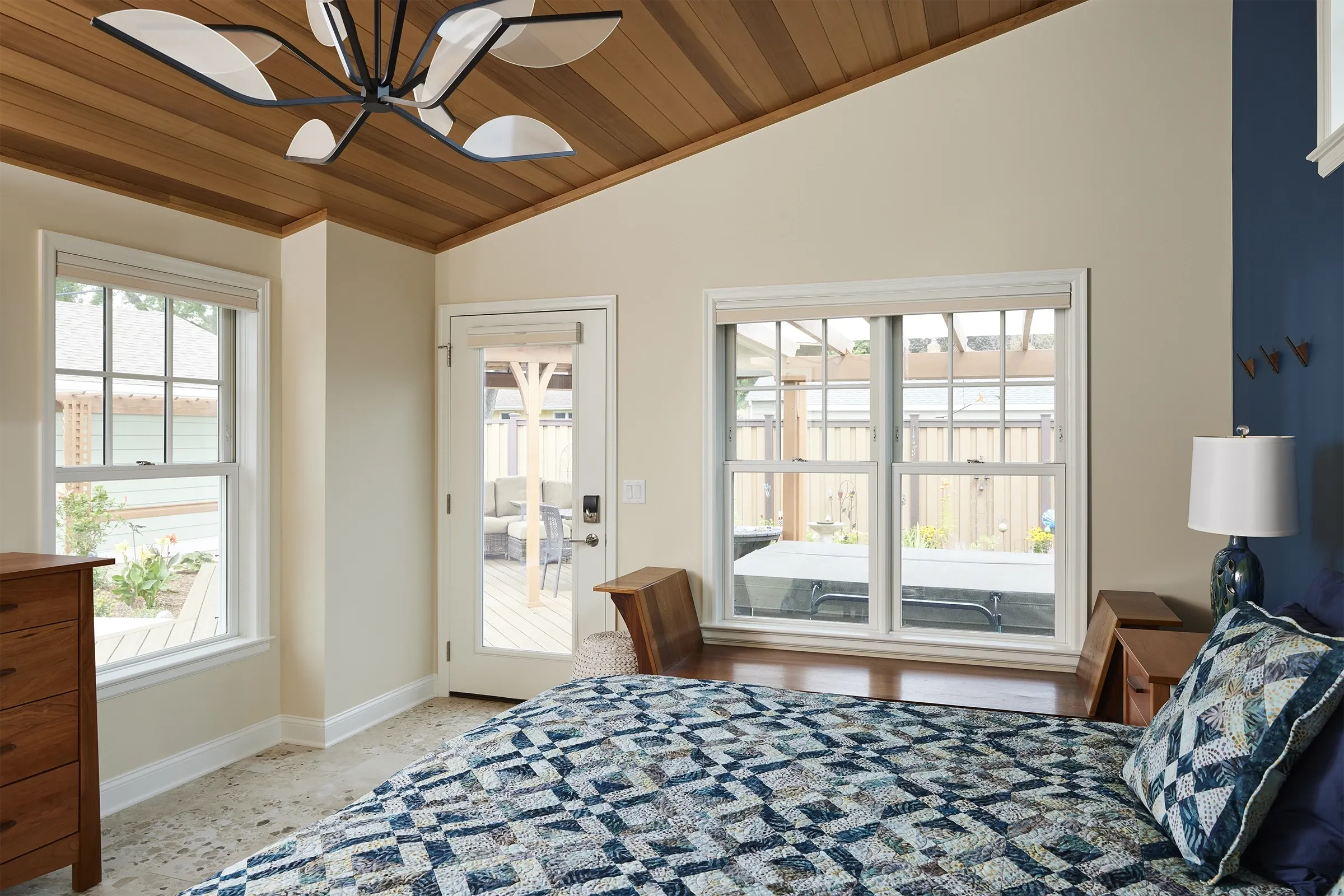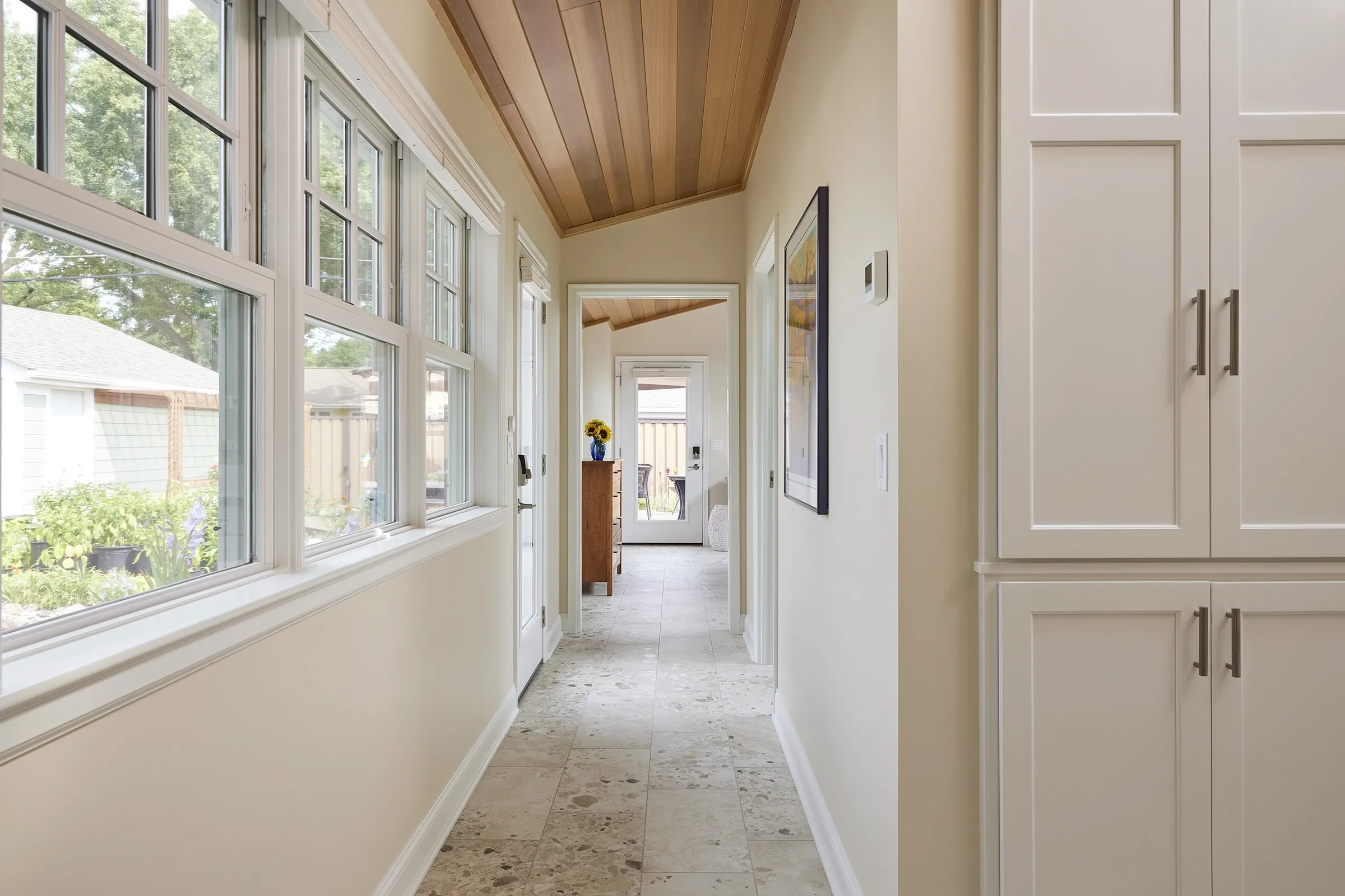 The owners of this house were retired and had their primary bedroom on the second floor and wanted to create a wheelchair accessible suite on the main level for aging in place. The project entailed an addition into the backyard for the new owner’s suite and new siding, trim and windows on the main house. The addition features fully accessible spaces, large windows and skylights, vaulted ceilings, main level laundry, a new walk-in closet and customized storage. Custom tile layouts, sculptural light fixtures, and wood ceilings accentuate the spaces. The project received two National Association of the Remodeling Industry (NARI) awards for the Universal Bath & Residential Addition Categories.