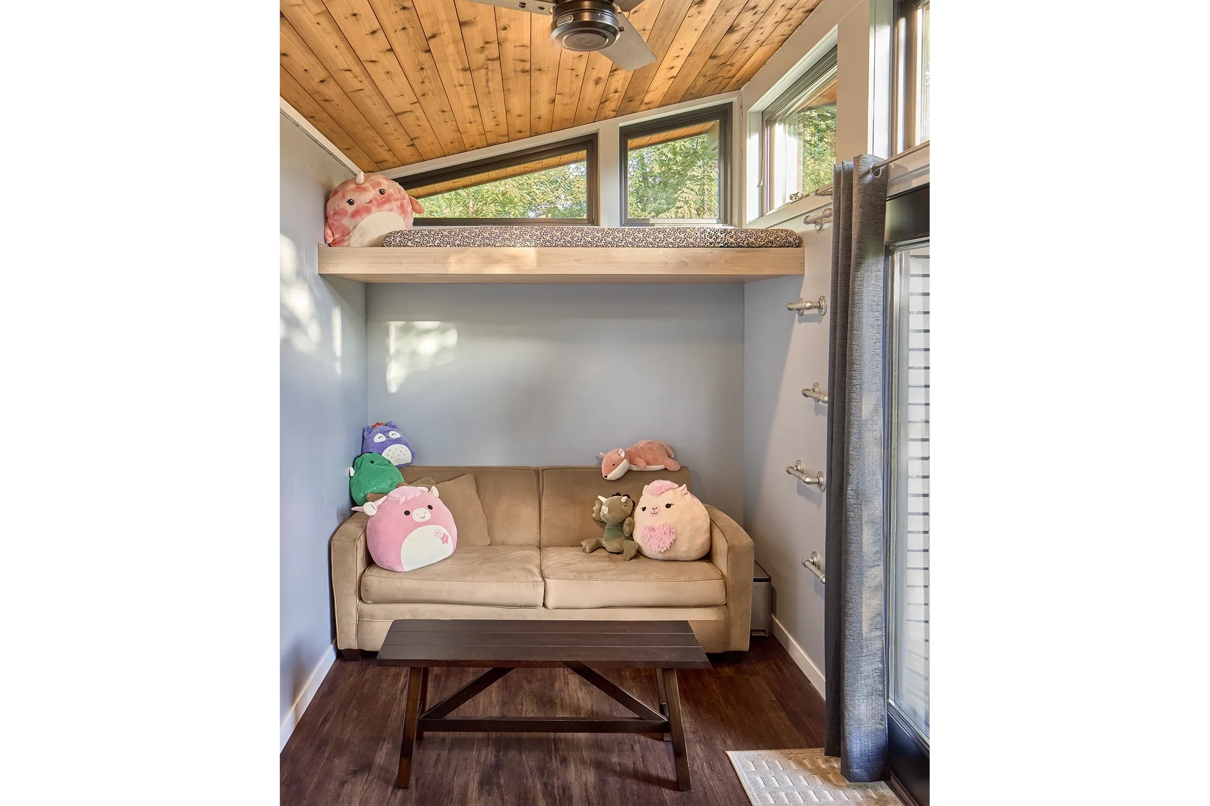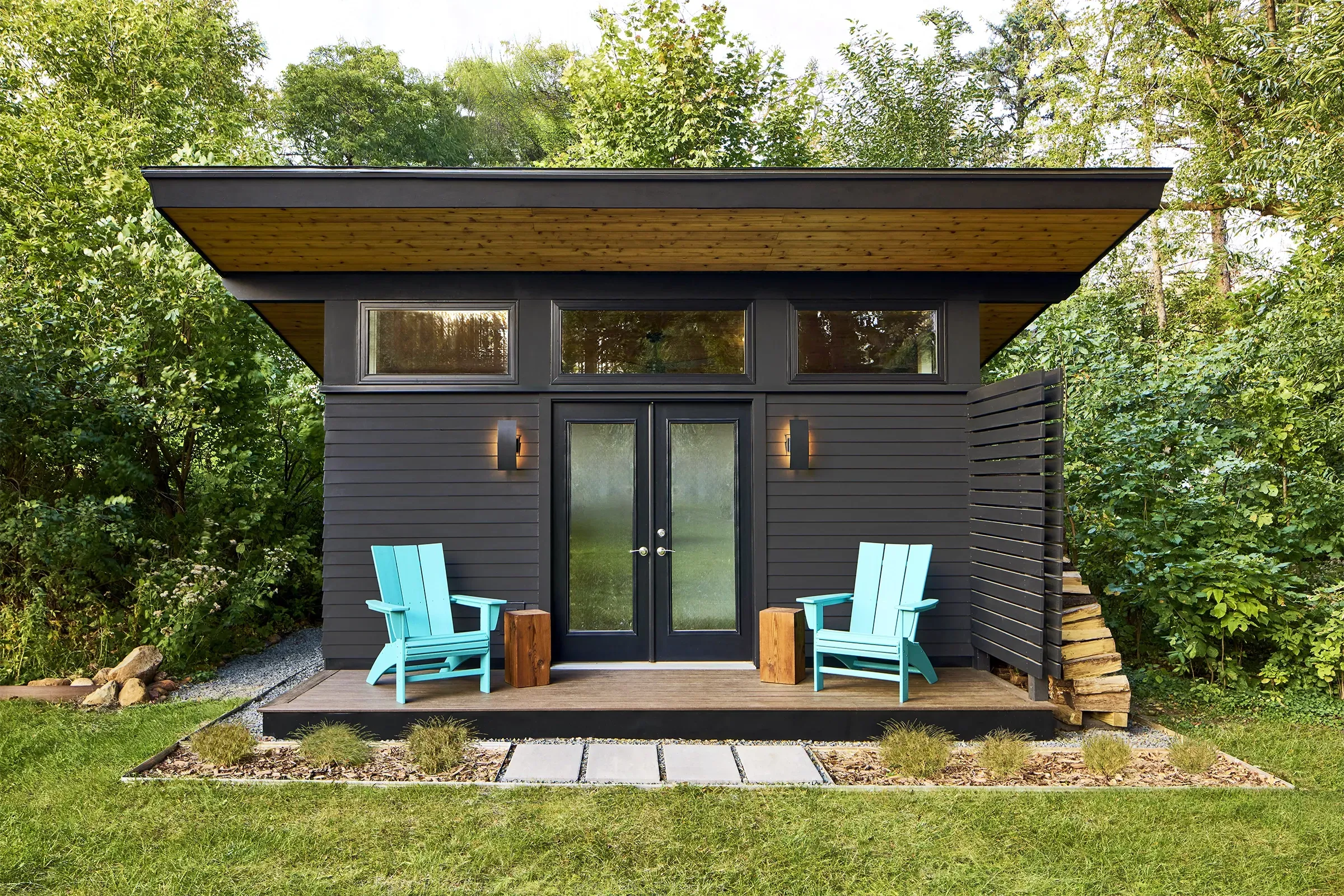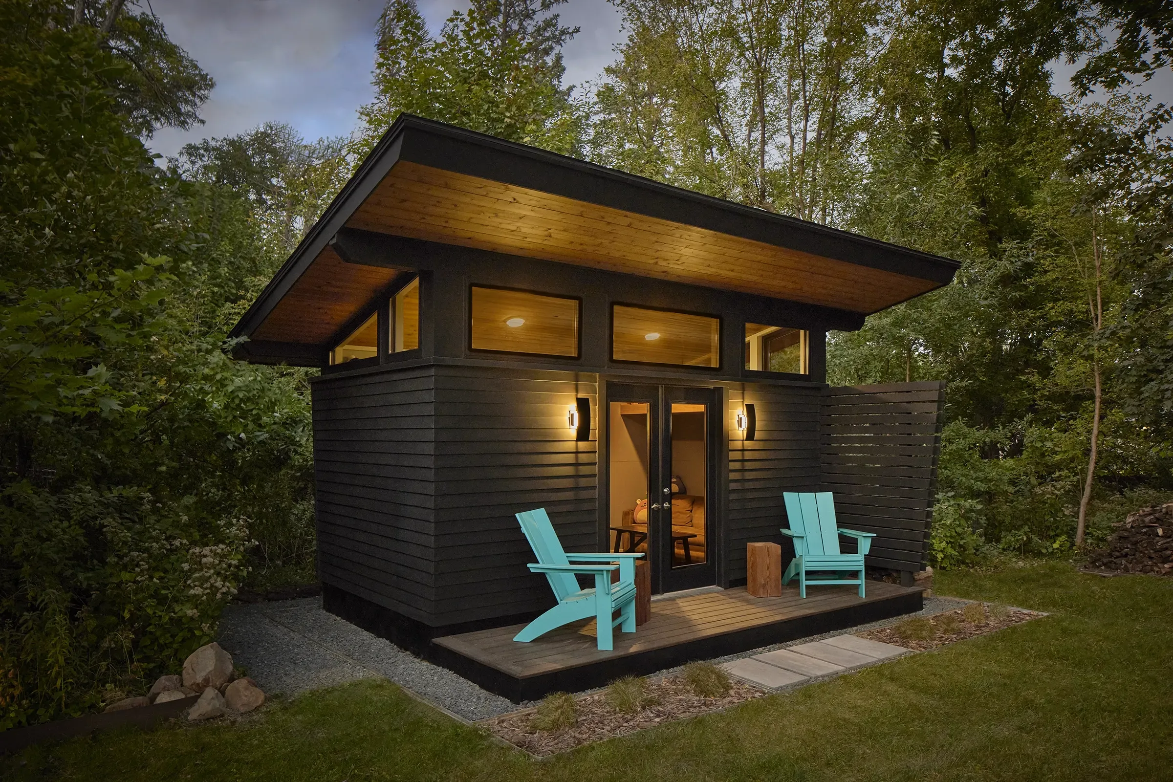 The owners had an older rambler with limited space and a large lot. They were in need of a space for the kids to hang out. The new bunkhouse offers a less expensive solution to adding on to the existing house while creating a versatile multi-use “away” space that could also serve as a future art studio, tiki bar, or she shed. The goal was to create a modern structure that is integrated into the backyard with interesting design elements to make it look less like a typical shed. It is located on the edge of the woods adjacent to the fire pit so it is visible from the house while being nestled into the existing tree line. The dark exterior offers a modern vibe that contrasts and accentuates the cedar ceiling. The angled wall corners, slat walls, and tight siding exposures create a sculptural structure rich in textures and details that can be appreciated as viewed from the house as well as up close. The slat walls, inspired by rural corn cribs, and deep overhangs create a protected wood storage area. The space has a heat pump and AC for year round use. The interiors feature durable paneled walls, two upper maple bunks with wall ladders and space below for sofas and seating. It can comfortably sleep five.