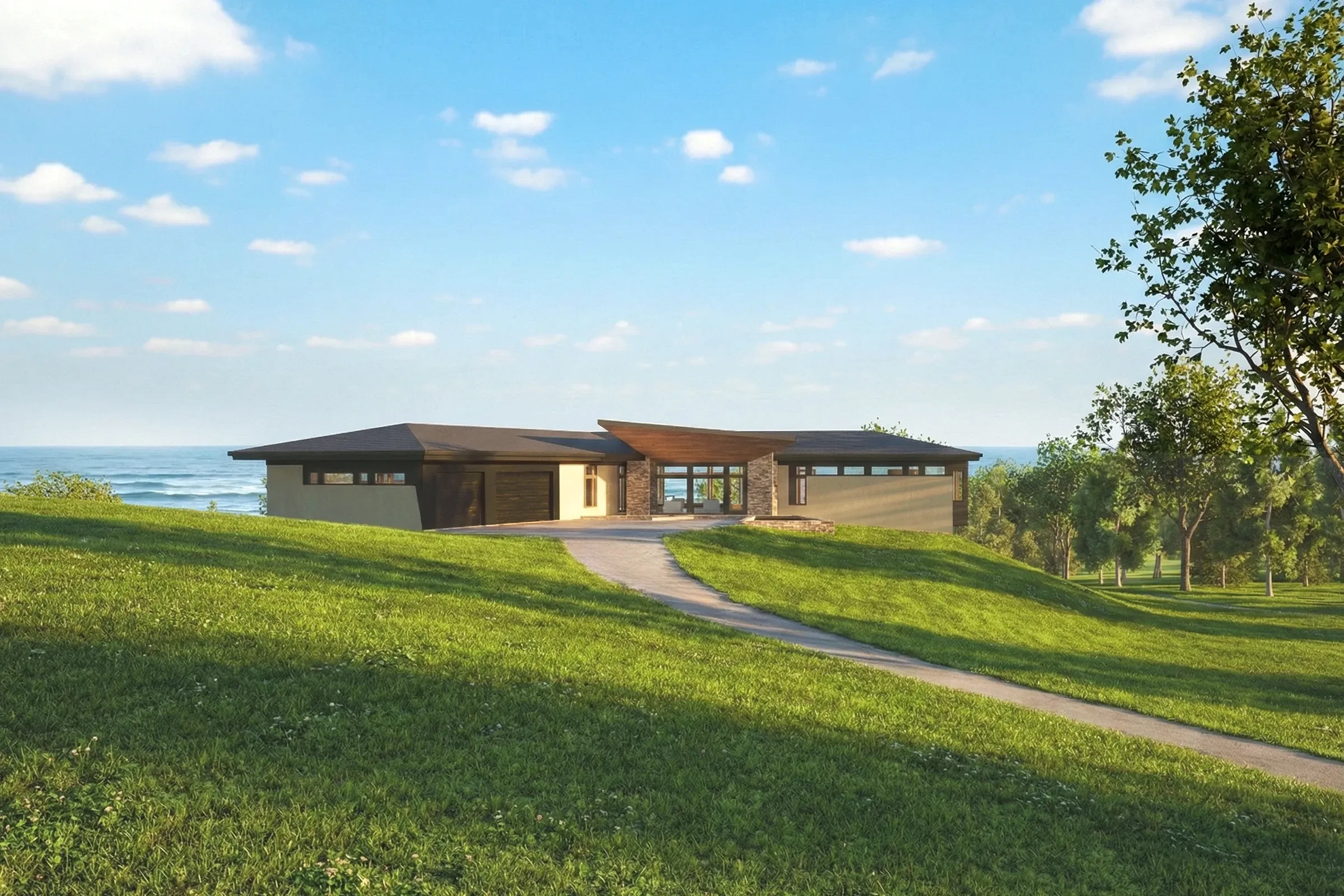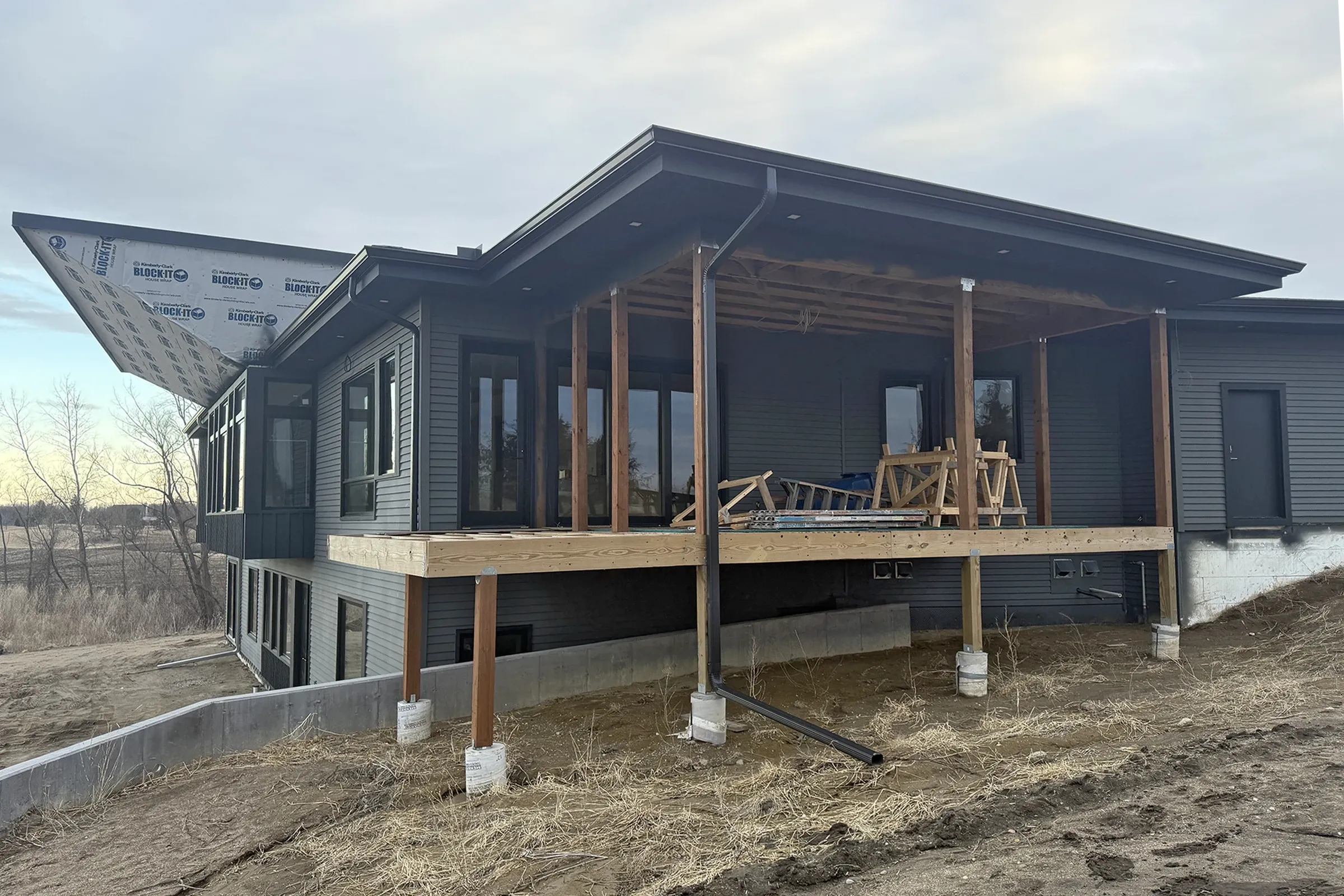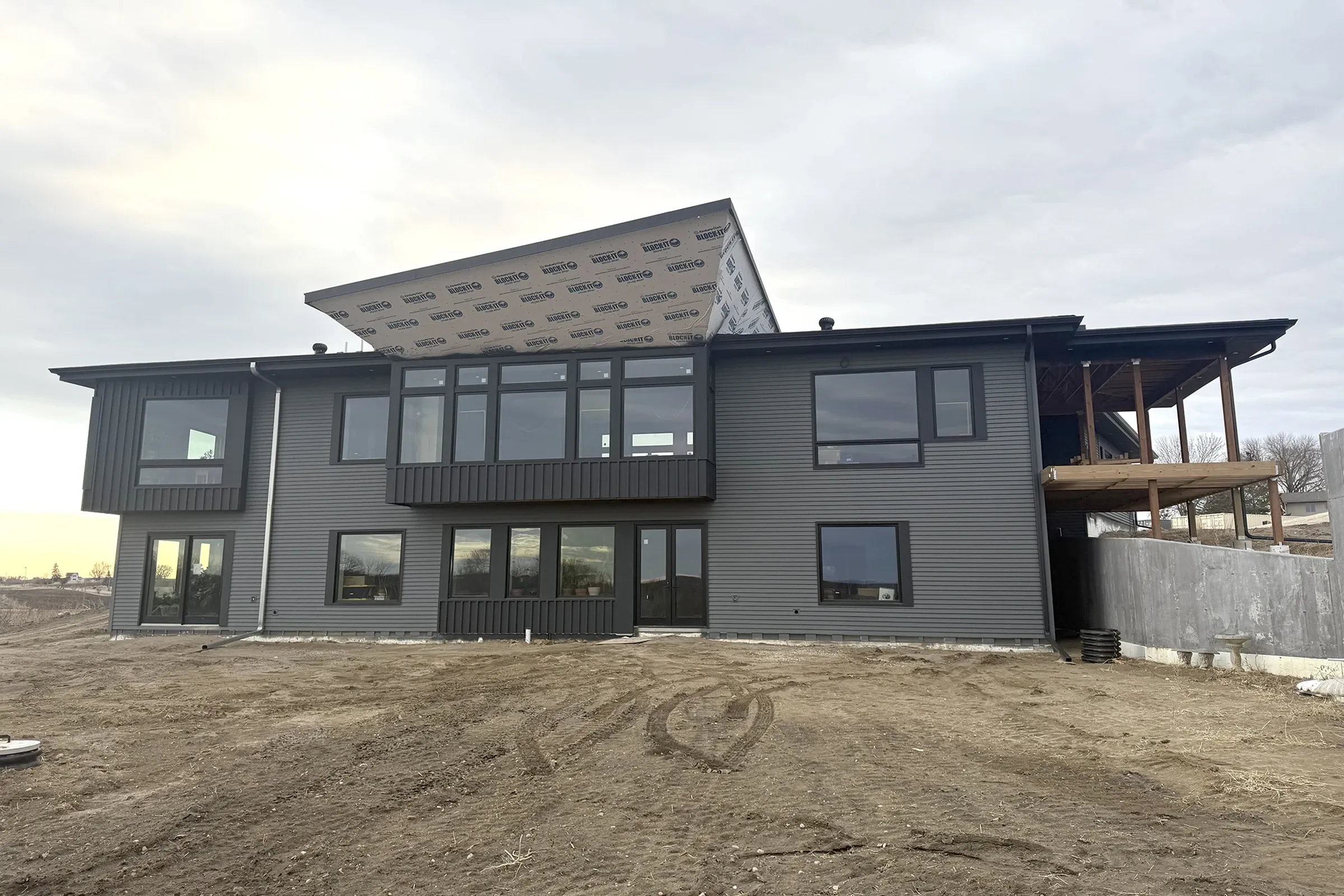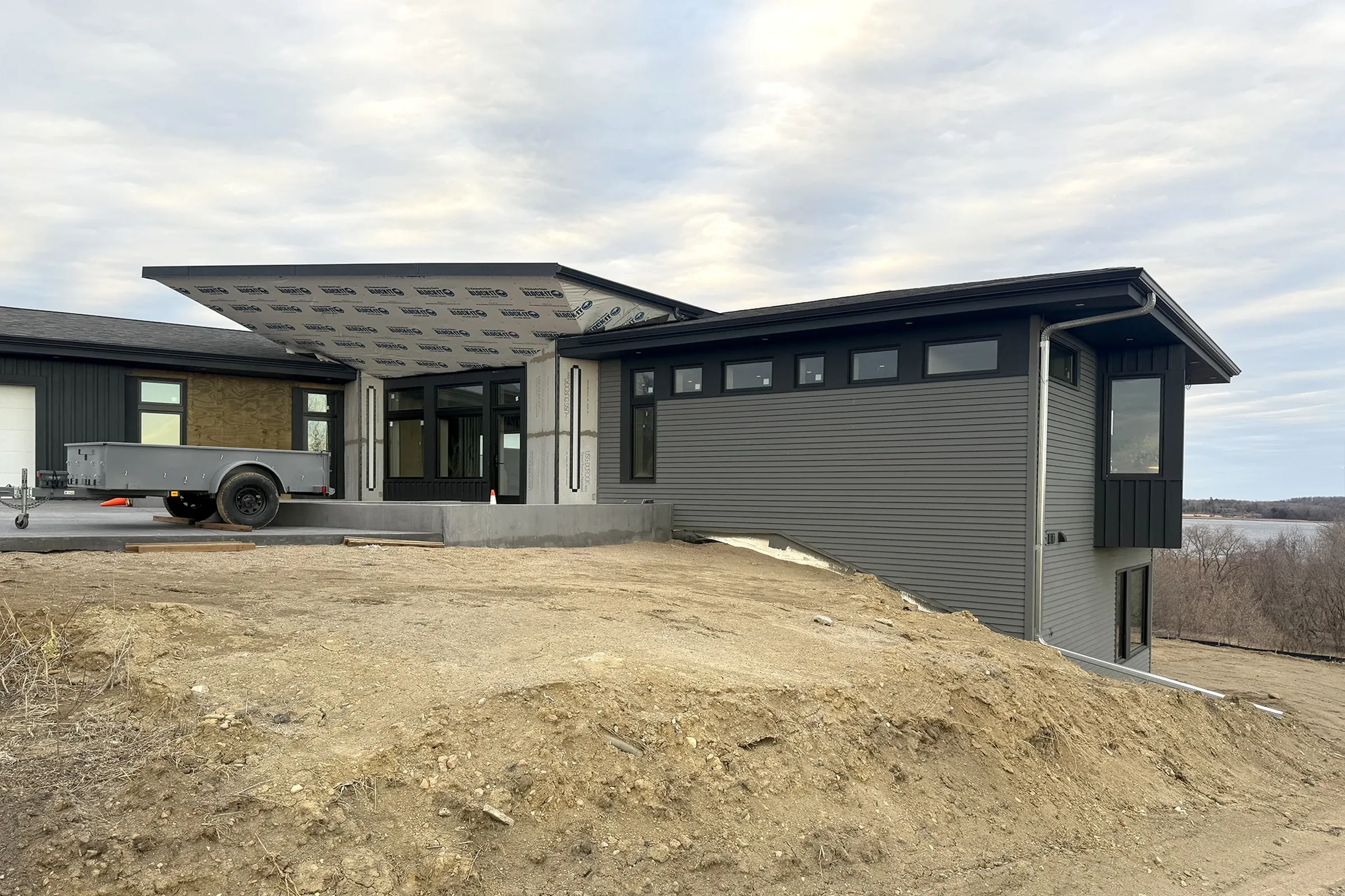 This new retirement home overlooks WhaleTail Lake in Rural Minnesota. The owners wanted a unique modern home evocative of the sweeping lake view setting. The home was sited on a hillside to capitalize on views & sunlight. The front is intentionally lower and more modest with the more dramatic central “sail” roof form extending through to the back & hinting at the dramatic lakeside form. The central glass entry opens to the large glass wall on the lakeside framing the views upon entry. The sail roof projects out the front and back providing shade and a covered entry while housing an open great room, entry, and stair below the interior vaulted ceiling. The lakeside cantilever projects out toward the lake allowing wrap around windows for the expansive views. The dark cube on the corner is the owner’s suite tilted to frame the ideal views and add interest to the form. The screened porch is perched off to the side so as not to block lake views from inside the house and to balance the exterior form. The house was made wheelchair accessible with zero step entries, an elevator, curbless showers, and large doorways. Construction is underway and more photos to come.