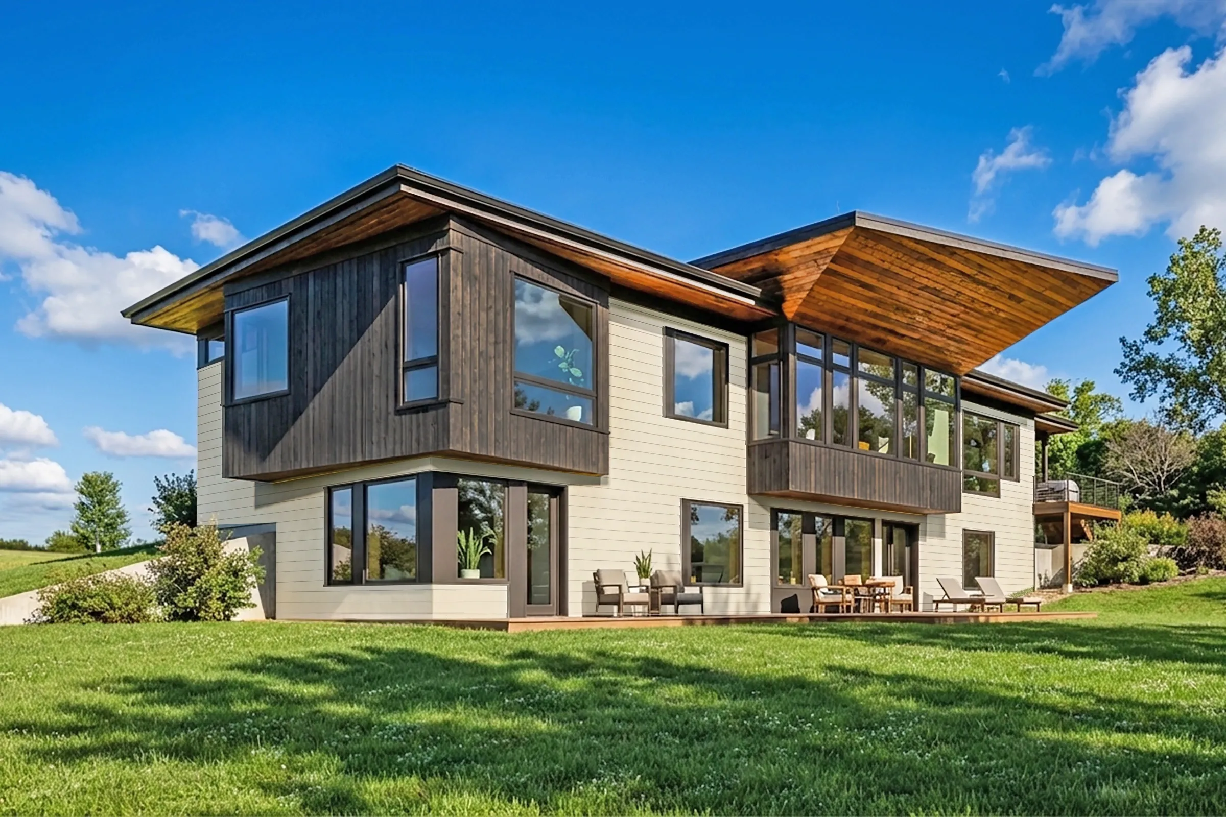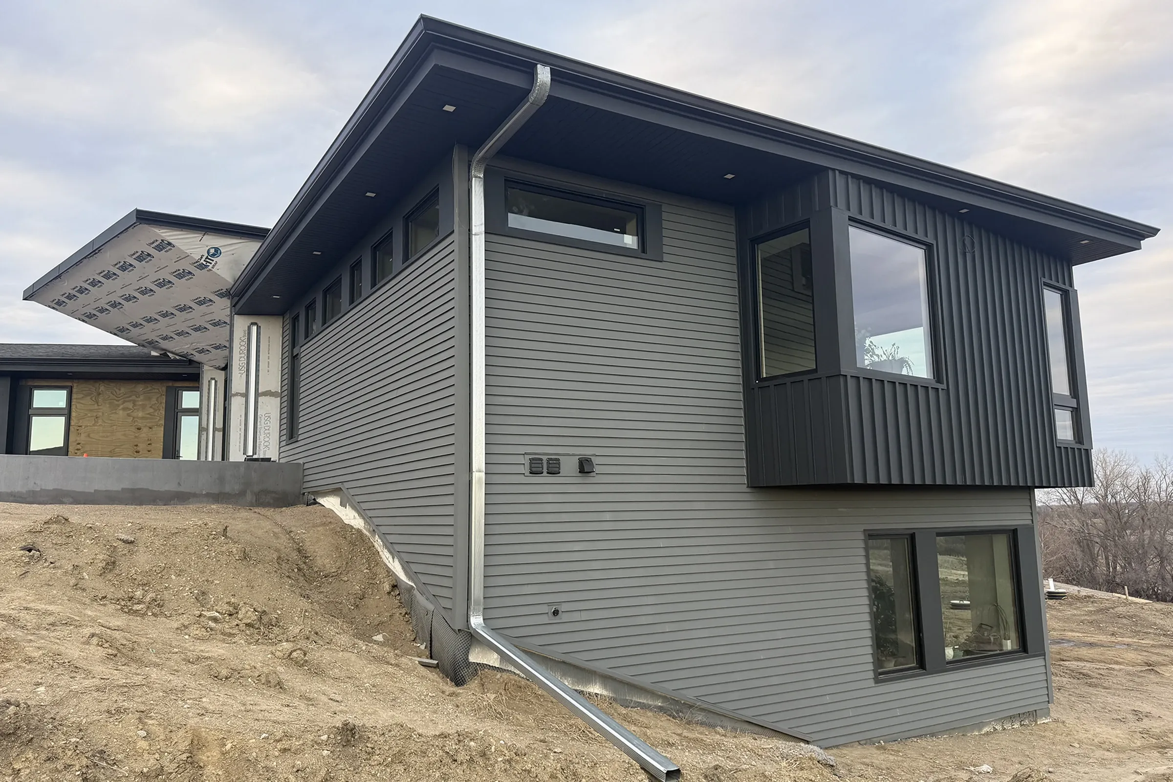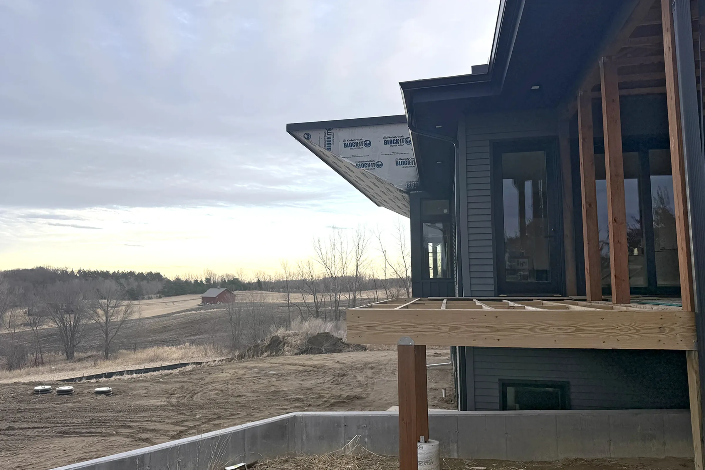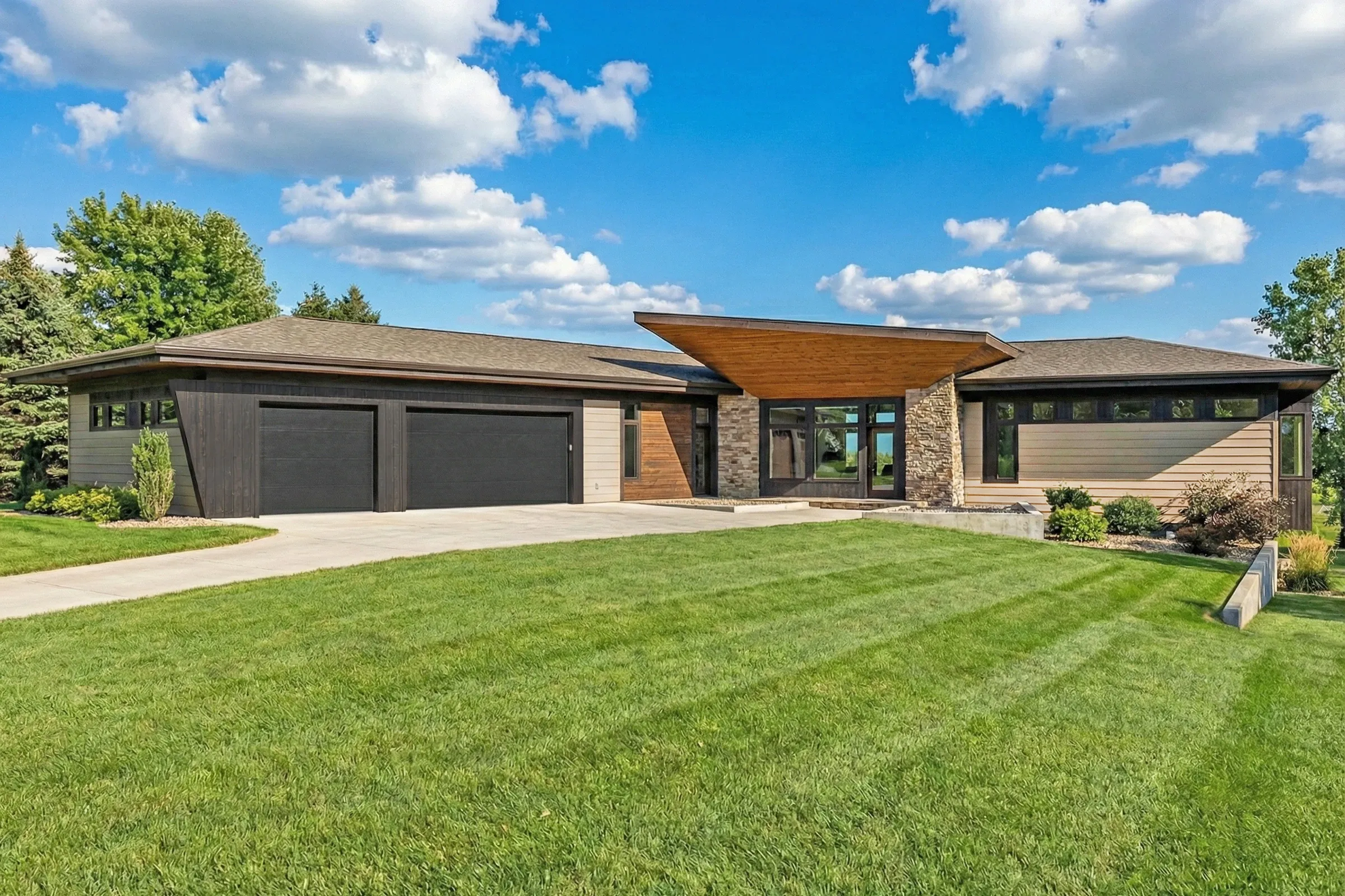This new retirement home overlooks WhaleTail Lake in Rural Minnesota. The owners wanted a unique modern home evocative of the sweeping lake view setting. The home was sited on a hillside to capitalize on views & sunlight. The front is intentionally lower and more modest with the more dramatic central “sail” roof form extending through to the back & hinting at the dramatic lakeside form. The central glass entry opens to the large glass wall on the lakeside framing the views upon entry. The sail roof projects out the front and back providing shade and a covered entry while housing an open great room, entry, and stair below the interior vaulted ceiling. The lakeside cantilever projects out toward the lake allowing wrap around windows for the expansive views. The dark cube on the corner is the owner’s suite tilted to frame the ideal views and add interest to the form. The screened porch is perched off to the side so as not to block lake views from inside the house and to balance the exterior form. The house was made wheelchair accessible with zero step entries, an elevator, curbless showers, and large doorways. Construction is underway and more photos to come.